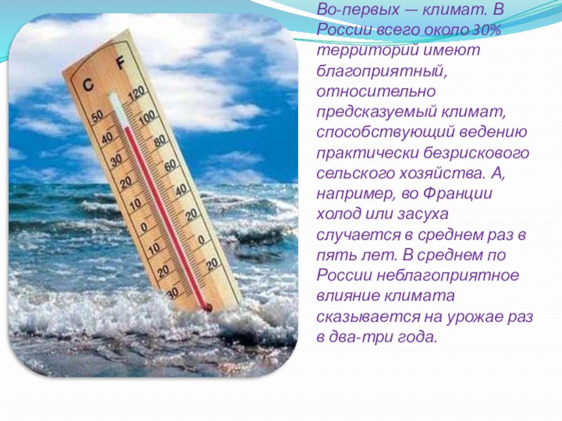 Слайд 4Во-первых — климат. В России всего около 30% территорий имеют благоприятный,