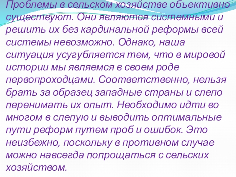 их без кардинальной реформы всей системы невозможно. Однако, наша ситуация усугубляется тем, что в мировой истории мы являемся в своем роде первопроходцами. Соответственно, нельзя брать за образец западные страны и слепо перенимать их опыт. Необходимо идти во многом в слепую и выводить оптимальные пути реформ путем проб и ошибок. Это неизбежно, поскольку в противном случае можно навсегда попрощаться с сельских хозяйством.