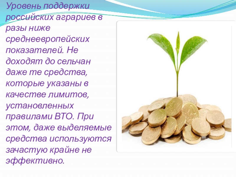 Слайд 5Во-вторых – финансирование. Уровень поддержки российских аграриев в разы ниже среднеевропейских