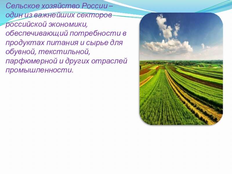 Слайд 2Сельское хозяйство России – один из важнейших секторов российской экономики, обеспечивающий