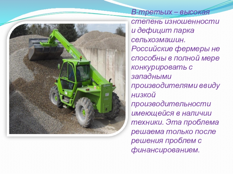 Слайд 6В-третьих – высокая степень изношенности и дефицит парка сельхозмашин. Российские фермеры