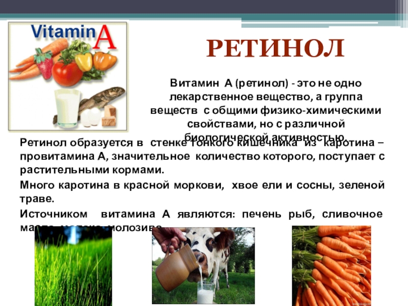 Витамин А (ретинол) - это не одно лекарственное вещество, а группа веществ с общими физико-химическими свойствами, но с различной биологической активностью.
