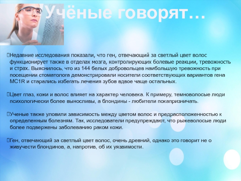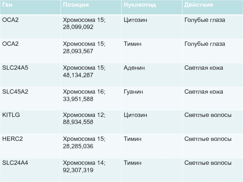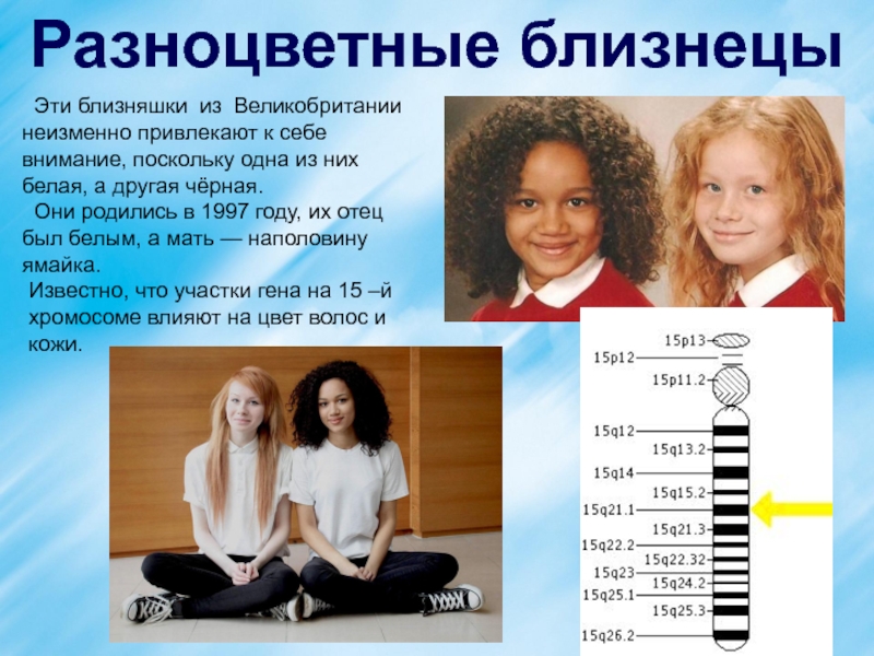 Известно, что участки гена на 15 –й хромосоме влияют на цвет волос и кожи.