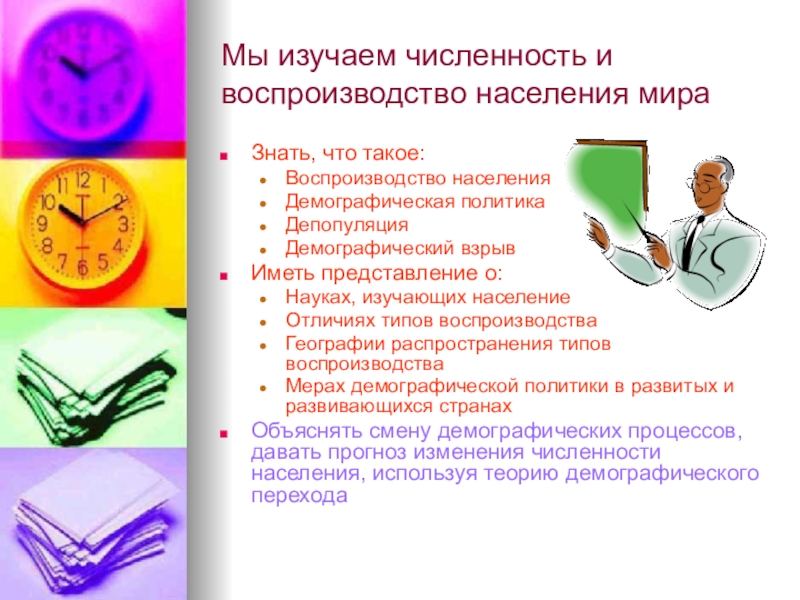 Мы изучаем численность и воспроизводство населения мираЗнать, что такое:Воспроизводство населенияДемографическая политикаДепопуляцияДемографический взрывИметь представление о:Науках, изучающих населениеОтличиях типов
