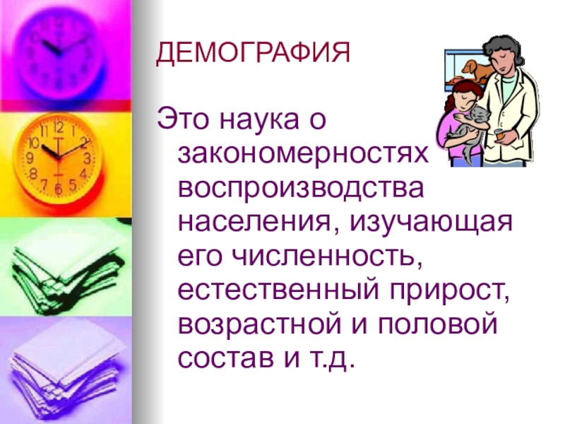 Это наука о закономерностях воспроизводства населения, изучающая его численность, естественный прирост,