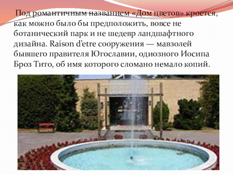 бы предположить, вовсе не ботанический парк и не шедевр ландшафтного дизайна. Raison d’etre сооружения — мавзолей бывшего правителя Югославии, одиозного Иосипа Броз Тито, об имя которого сломано немало копий.