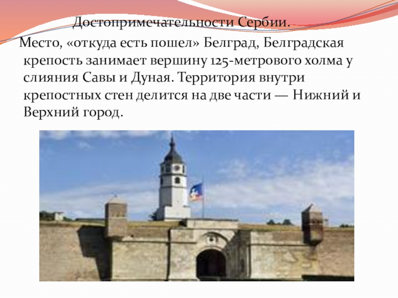 Место, «откуда есть пошел» Белград, Белградская крепость занимает вершину 125-метрового холма у слияния Савы и Дуная. Территория внутри крепостных стен делится на две части — Нижний и Верхний город.