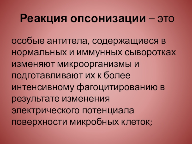 сыворотках изменяют микроорганизмы и подготавливают их к более интенсивному фагоцитированию в результате изменения электрического потенциала поверхности микробных клеток;