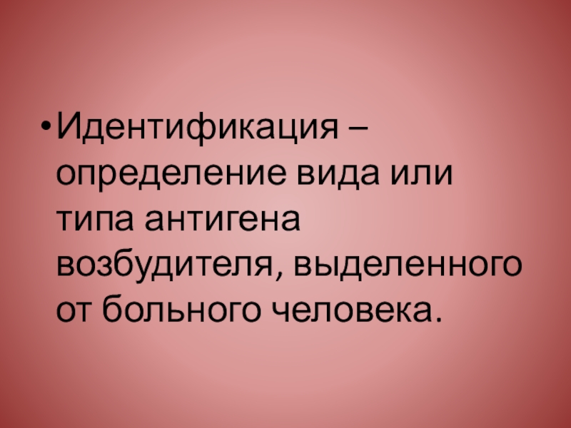 Слайд 3Идентификация – определение вида или типа антигена возбудителя, выделенного от больного