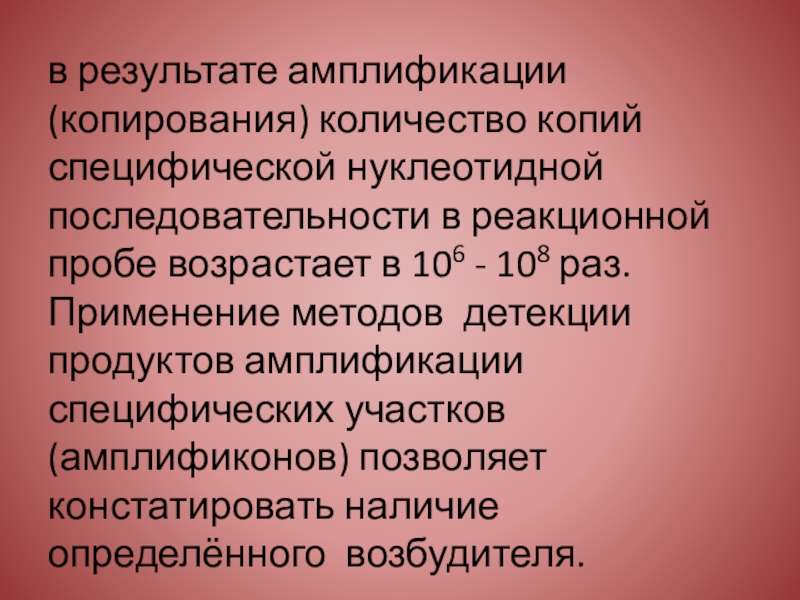 пробе возрастает в 106 - 108 раз. Применение методов детекции продуктов амплификации специфических участков (амплификонов) позволяет констатировать наличие определённого возбудителя.