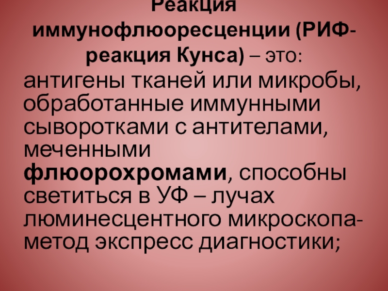 Слайд 14Реакция иммунофлюоресценции (РИФ- реакция Кунса) – это: