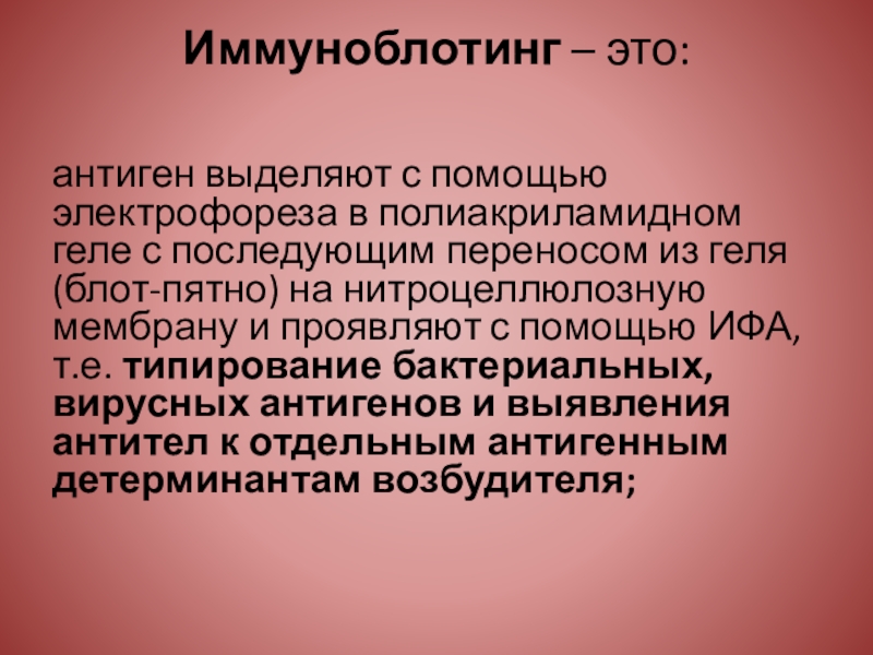 последующим переносом из геля (блот-пятно) на нитроцеллюлозную мембрану и проявляют с помощью ИФА, т.е. типирование бактериальных, вирусных антигенов и выявления антител к отдельным антигенным детерминантам возбудителя;