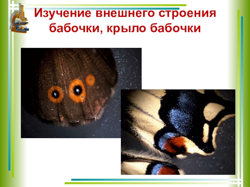 Слайд 6Изучение внешнего строения бабочки, крыло бабочки