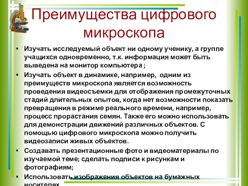 Преимущества цифрового микроскопа Изучать исследуемый объект ни одному ученику, а группе учащихся одновременно, т.к. информация может быть выведена на монитор компьютера ; Изучать объект в динамике, например, одним из преимуществ микроскопа является возможность проведения видеосъемки для