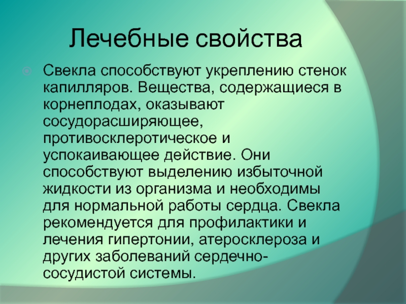 сосудорасширяющее, противосклеротическое и успокаивающее действие. Они способствуют выделению избыточной жидкости из организма и необходимы для нормальной работы сердца. Свекла рекомендуется для профилактики и лечения гипертонии, атеросклероза и других заболеваний сердечно-сосудистой системы.