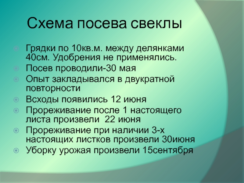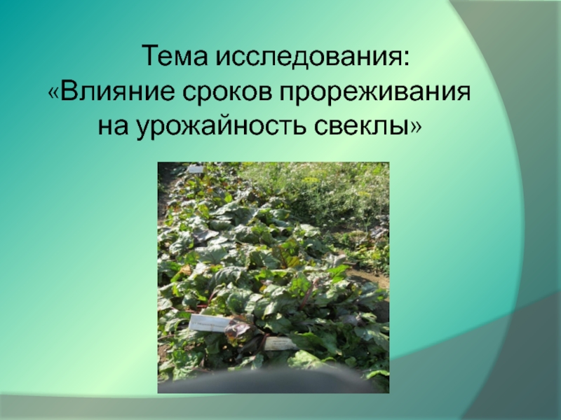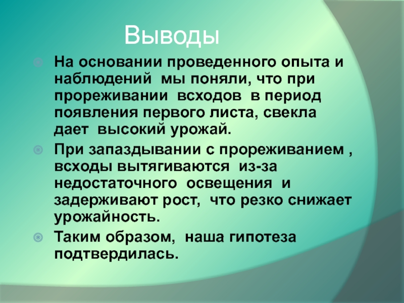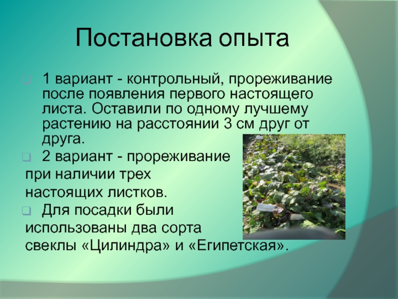 проведенного опыта и наблюдений мы поняли, что при прореживании всходов в период появления первого листа, свекла дает высокий урожай.