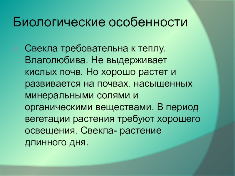 хорошо растет и развивается на почвах. насыщенных минеральными солями и органическими веществами. В период вегетации растения требуют хорошего освещения. Свекла- растение длинного дня.