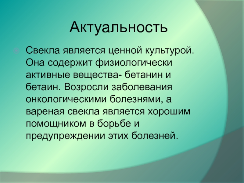 ценной культурой. Она содержит физиологически активные вещества- бетанин и бетаин. Возросли заболевания онкологическими болезнями, а вареная свекла является хорошим помощником в борьбе и предупреждении этих болезней.