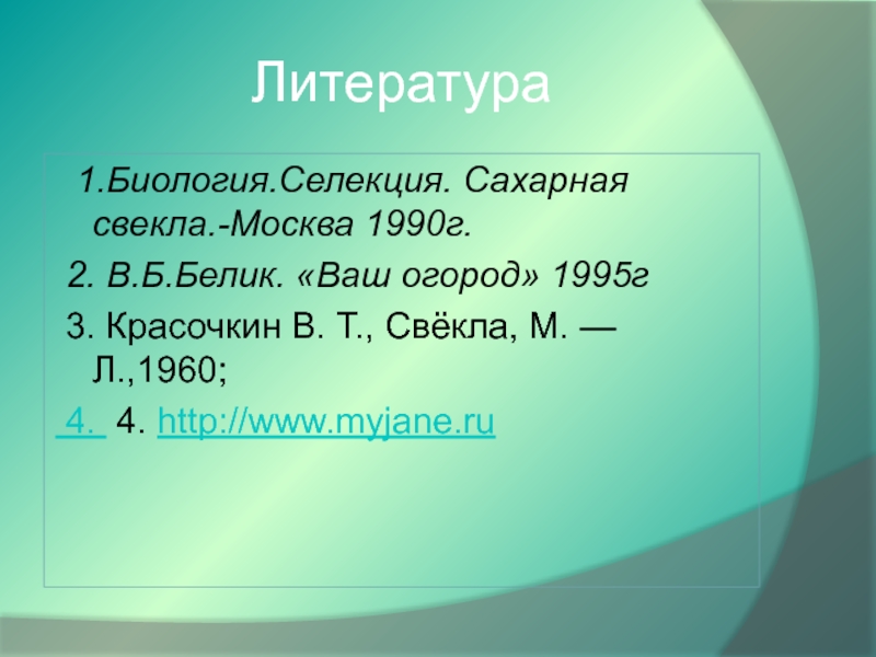 1.Биология.Селекция. Сахарная свекла.-Москва 1990г.