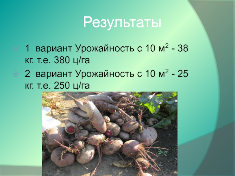 2 вариант Урожайность с 10 м2 - 25 кг. т.е. 250 ц/га