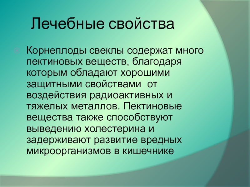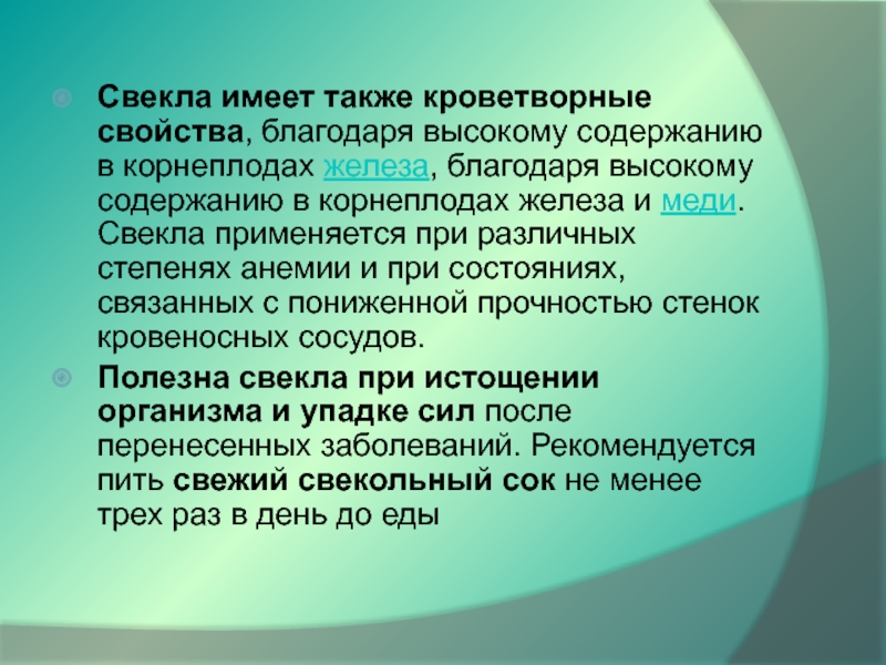 Слайд 17Свекла имеет также кроветворные свойства, благодаря высокому содержанию в корнеплодах железа,