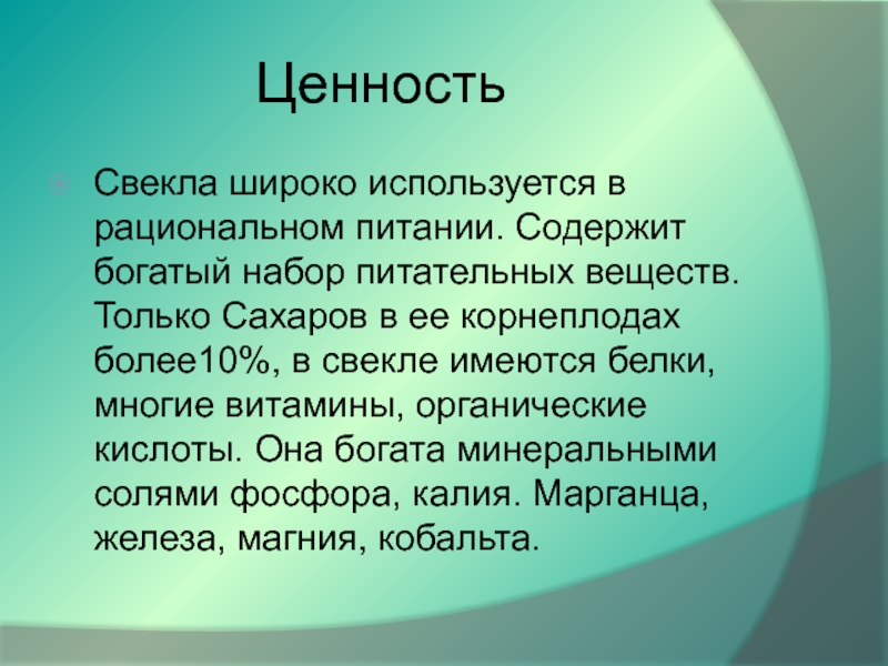 используется в рациональном питании. Содержит богатый набор питательных веществ. Только Сахаров в ее корнеплодах более10%, в свекле имеются белки, многие витамины, органические кислоты. Она богата минеральными солями фосфора, калия. Марганца, железа, магния, кобальта.