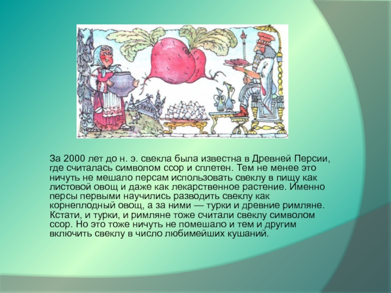 Персии, где считалась символом ссор и сплетен. Тем не менее это ничуть не мешало персам использовать свеклу в пищу как листовой овощ и даже как лекарственное растение. Именно персы первыми научились разводить свеклу как корнеплодный овощ, а за ними — турки и древние римляне. Кстати, и турки, и римляне тоже считали свеклу символом ссор. Но это тоже ничуть не помешало и тем и другим включить свеклу в число любимейших кушаний.