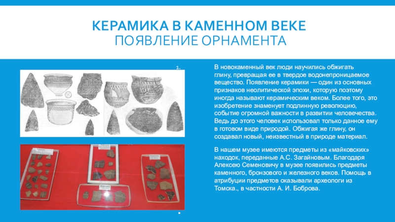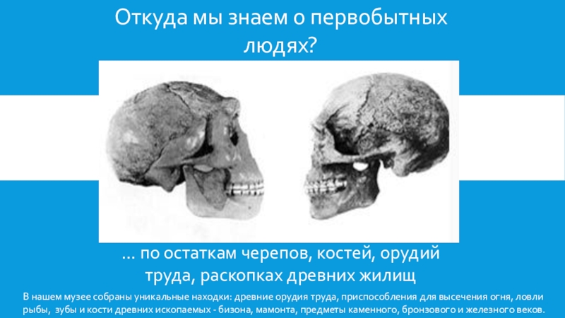 В нашем музее собраны уникальные находки: древние орудия труда, приспособления для высечения огня, ловли рыбы, зубы и кости древних ископаемых - бизона, мамонта, предметы каменного, бронзового и железного веков.