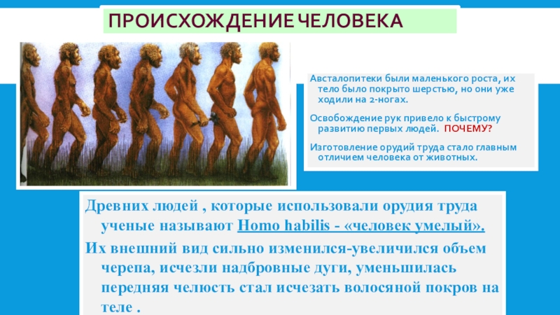 Древних людей , которые использовали орудия труда ученые называют Homo habilis - «человек умелый».