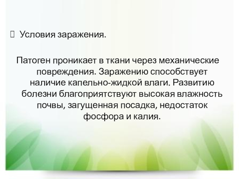 наличие капельно-жидкой влаги. Развитию болезни благоприятствуют высокая влажность почвы, загущенная посадка, недостаток фосфора и калия.