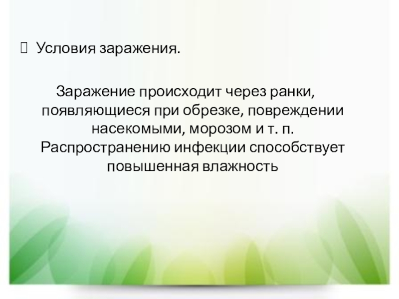 Заражение происходит через ранки, появляющиеся при обрезке, повреждении насекомыми, морозом