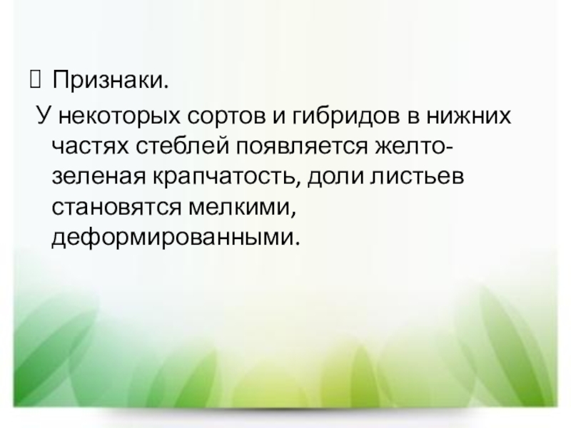 желто-зеленая крапчатость, доли листьев становятся мелкими, деформированными.
