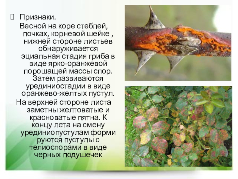 листьев обнаруживается эциальная стадия гриба в виде ярко-оранжевой порошащей массы спор. Затем развиваются урединиостадии в виде оранжево-желтых пустул.