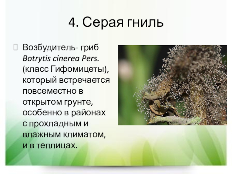 Возбудитель- гриб Botrytis cinerea Pers. (класс Гифомицеты), который встречается