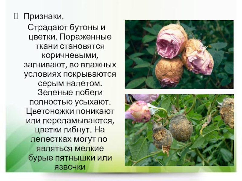 Страдают бутоны и цветки. Пораженные ткани становятся коричневыми, загнивают, во