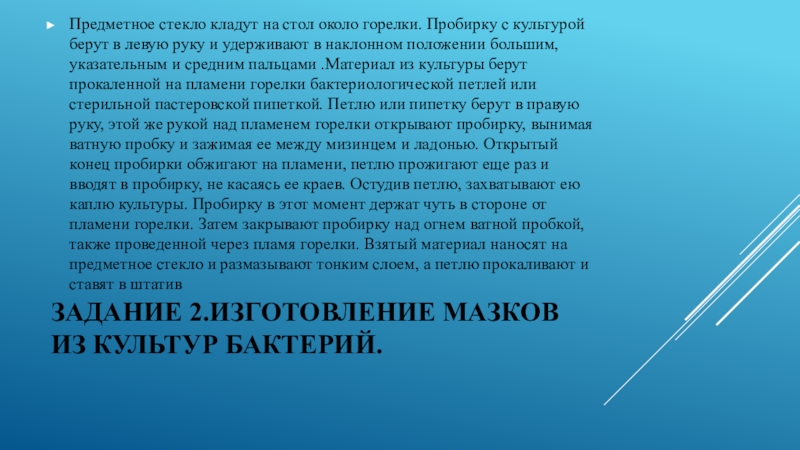 Слайд 27Задание 2.Изготовление мазков из культур бактерий.