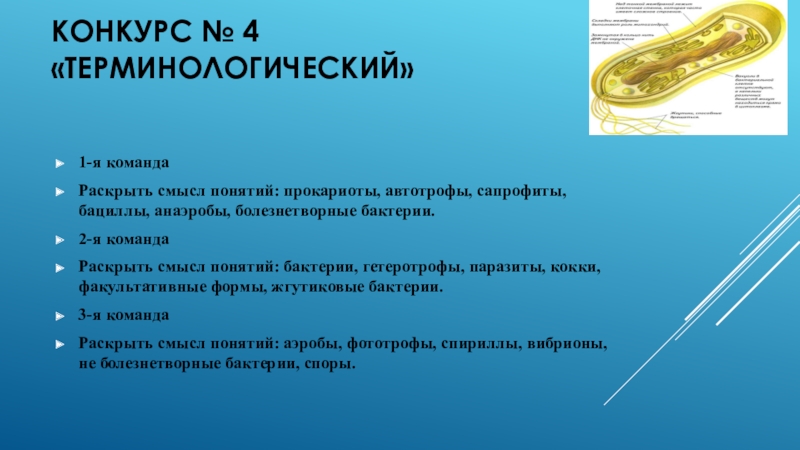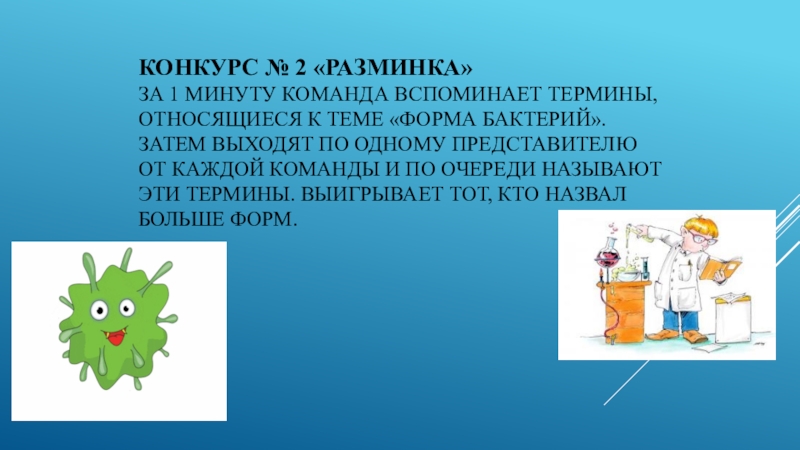 теме «Форма бактерий». Затем выходят по одному представителю от каждой команды и по очереди называют эти термины. Выигрывает тот, кто назвал больше форм.