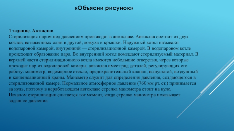 Автоклав состоит из двух котлов, вставленных один в другой, кожуха и крышки. Наружный котел называют водопаровой камерой, внутренний — стерилизационной камерой. В водопаровом котле происходит образование пара. Во внутренний котел помещают стерилизуемый материал. В верхней части стерилизационного котла имеются небольшие отверстия, через которые проходит пар из водопаровой камеры. автоклав имеет ряд деталей, регулирующих его работу: манометр, водомерное стекло, предохранительный клапан, выпускной, воздушный и конденсационный краны. Манометр служит для определения давления, создающегося в стерилизованной камере. Нормальное атмосферное давление (760 мм рт. ст.) принимается за нуль, поэтому в неработающем автоклаве стрелка манометра стоит на нуле.