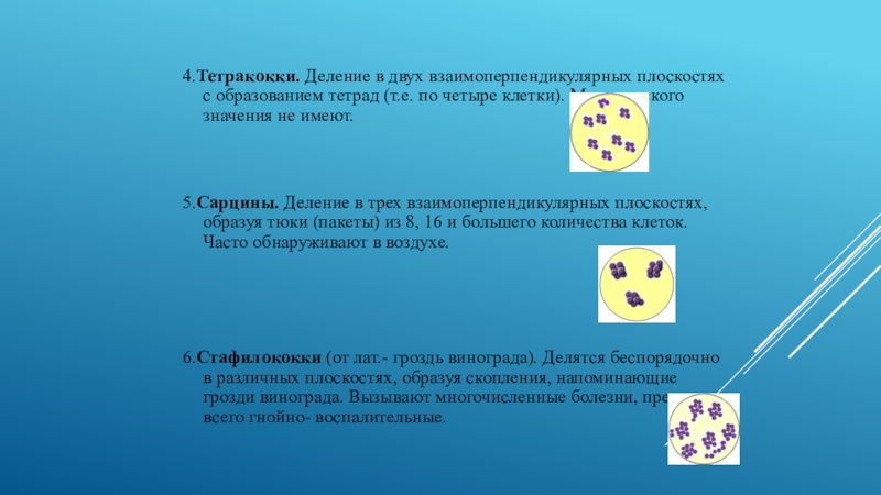 5.Сарцины. Деление в трех взаимоперпендикулярных плоскостях, образуя тюки (пакеты) из 8, 16 и большего количества клеток. Часто обнаруживают в воздухе.