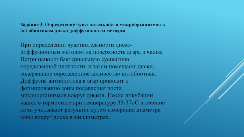 Слайд 29Задание 3. Определение чувствительности микроорганизмов к антибиотикам диско-диффузионным методом