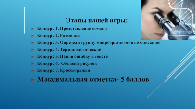 5 подсказок по одной из трех групп микроорганизмов. Чем быстрее будет дано название загаданных организмов, тем больший балл зарабатывает команда.