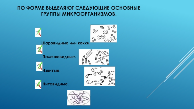 Слайд 12По форме выделяют следующие основные группы микроорганизмов.