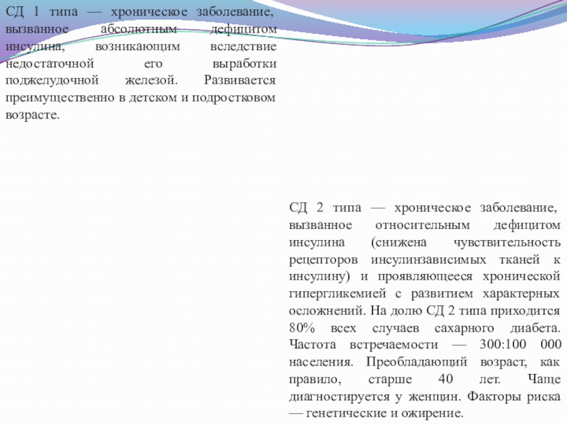 Слайд 46СД 1 типа — хроническое заболевание, вызванное абсолютным дефицитом инсулина, возникающим