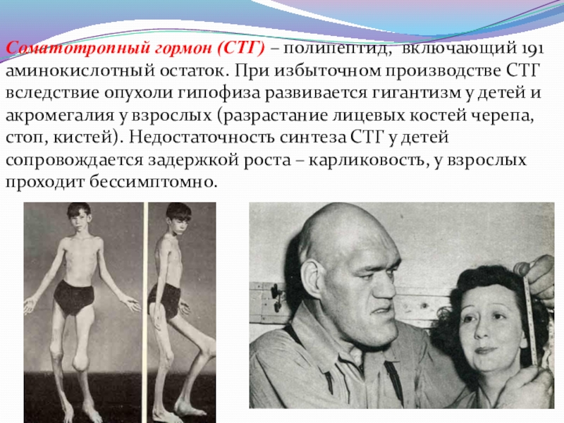 Слайд 16Соматотропный гормон (СТГ) – полипептид, включающий 191 аминокислотный остаток. При избыточном