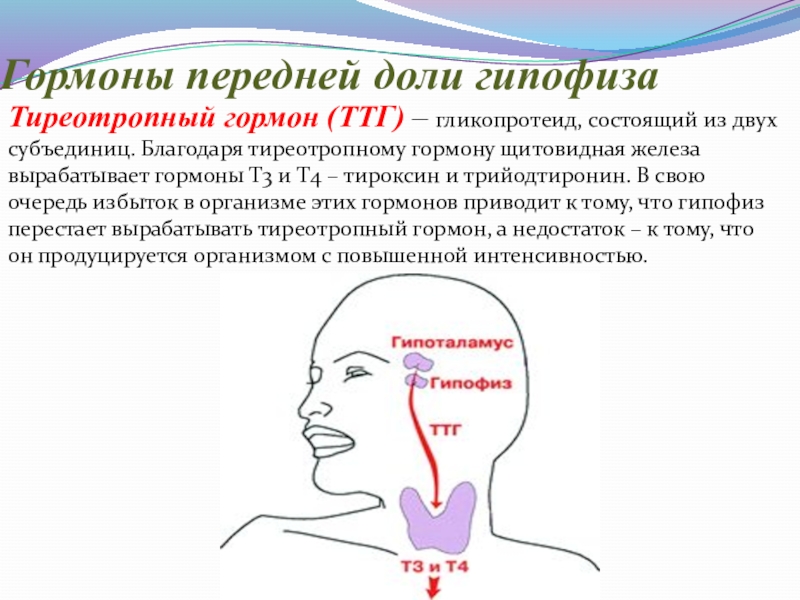 субъединиц. Благодаря тиреотропному гормону щитовидная железа вырабатывает гормоны Т3 и Т4 – тироксин и трийодтиронин. В свою очередь избыток в организме этих гормонов приводит к тому, что гипофиз перестает вырабатывать тиреотропный гормон, а недостаток – к тому, что он продуцируется организмом с повышенной интенсивностью.