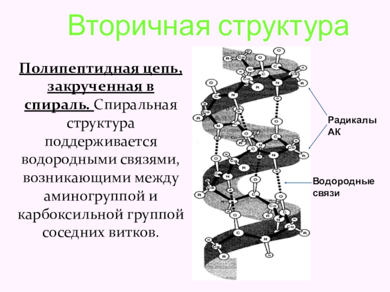 структура поддерживается водородными связями, возникающими между аминогруппой и карбоксильной группой соседних витков.