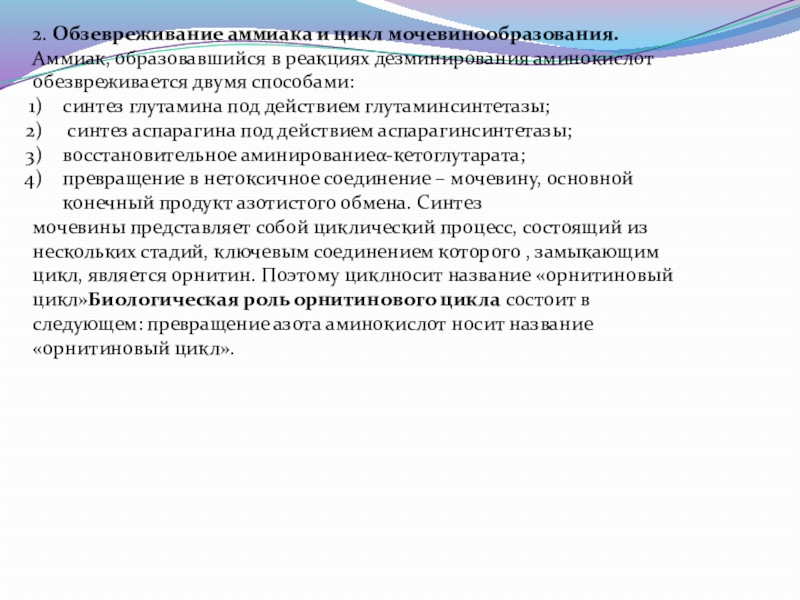 Слайд 432. Обзевреживание аммиака и цикл мочевинообразования.