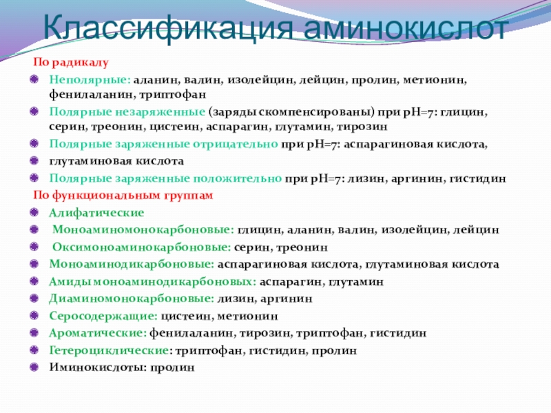 относятся: аланин, аргинин, аспартат, гистидин, глицин, глутамат, глутамин,