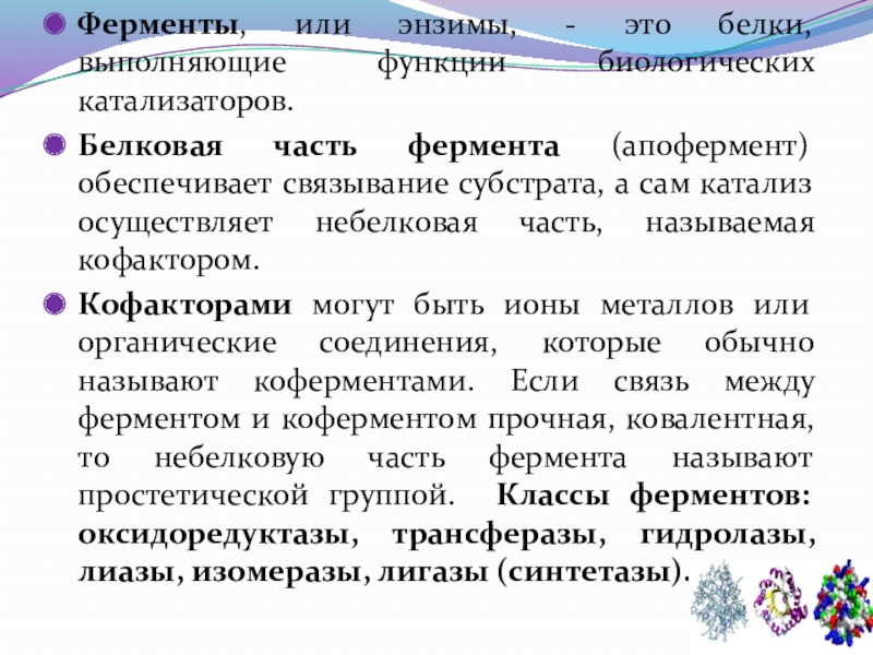 Кофакторами могут быть ионы металлов или органические соединения, которые обычно называют коферментами. Если связь между ферментом и коферментом прочная, ковалентная, то небелковую часть фермента называют простетической группой. Классы ферментов: оксидоредуктазы, трансферазы, гидролазы, лиазы, изомеразы, лигазы (синтетазы).