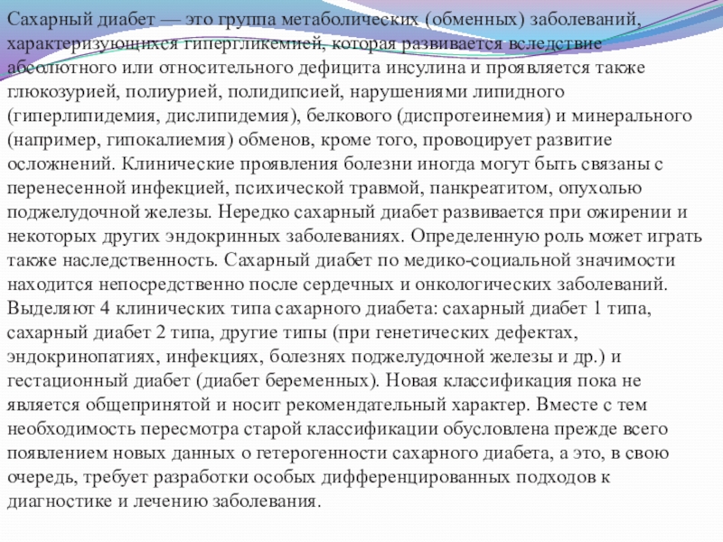 развивается вследствие абсолютного или относительного дефицита инсулина и проявляется также глюкозурией, полиурией, полидипсией, нарушениями липидного (гиперлипидемия, дислипидемия), белкового (диспротеинемия) и минерального (например, гипокалиемия) обменов, кроме того, провоцирует развитие осложнений. Клинические проявления болезни иногда могут быть связаны с перенесенной инфекцией, психической травмой, панкреатитом, опухолью поджелудочной железы. Нередко сахарный диабет развивается при ожирении и некоторых других эндокринных заболеваниях. Определенную роль может играть также наследственность. Сахарный диабет по медико-социальной значимости находится непосредственно после сердечных и онкологических заболеваний.